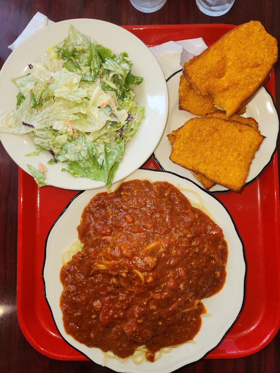Large Spaghetti with Half Mea Sauce Half Mushrooms Sauce